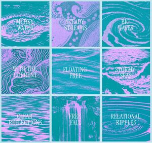 Zunächst wurden Teilnehmende dazu eingeladen, sich um ein Bild von der Serie “From Force to Flow” zu gruppieren – auf diesen Bildern sind ‘States of Water’ beschrieben und dargestellt, z.B. “Relational Ripples” oder “Murky Waters” oder “Big Waves”. Es sollte das ausgesucht werden, mit dem man sich momentan irgendwie identifiziert – entweder als Projektmitglied in Bezug auf seine eigene Situation, oder in Bezug auf das Verbundprojekt. Dabei tauschten sich die Teilnehmenden darüber aus, warum sie sich dort eingefunden haben.